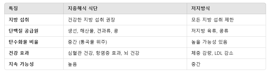 지중해식 식단은 지방 섭취를 제한하지 않고 건강한 지방을 강조합니다. 저지방식이 체중 감량에는 효과적일 수 있으나, 필수 지방산 부족 위험이 있을 수 있습니다. 따라서 지중해식 식단은 균형 잡힌 영양소 섭취와 지속 가능성 면에서 더 적합합니다.